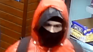 Law enforcement is searching for a man in a black jacket with a red bandana.