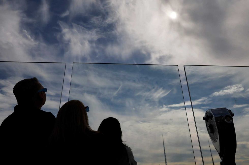 Getty ImagesPeople look to the sky on the observation deck of Edge at Hudson Yards before a partial solar eclipse on April 08, 2024 in New York City. While New York City isn't in the path of totality, it will see up to 90% of the sun covered by the moon. Around New York and in the path of totality, millions of residents and tourists are preparing for a total solar eclipse. Photo by Spencer Platt/Getty Images