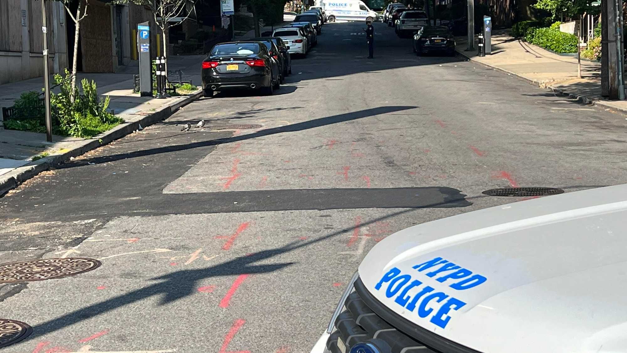 The NYPD is searching for two gunmen—one in a black hoodie and the other in a red hoodie—who fled the area on foot. They're believed to also be in their teens.