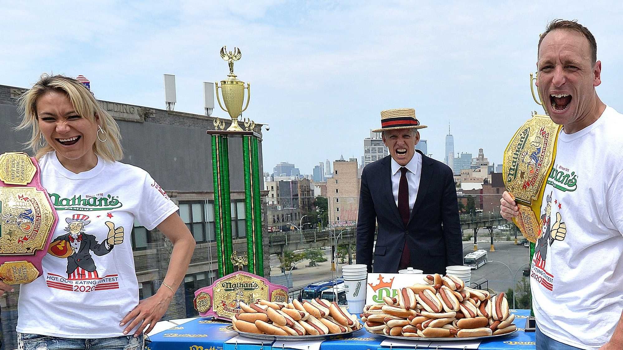 NEW YORK (AP/1010 WINS) — Record-holder Joey Chestnut won his 15th Nathan's Hot Dog Eating Contest in a row on Monday, and Miki Sudo came back from a one-year absence to win her eighth ketchup-pink belt as well.
