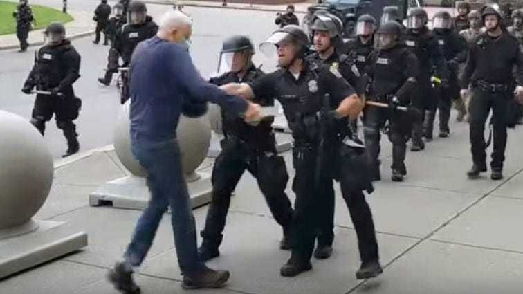 The footage shows a man identified as Martin Gugino approaching a line of helmeted officers holding batons as they clear demonstrators from Niagara Square around the time of an 8 p.m. curfew.