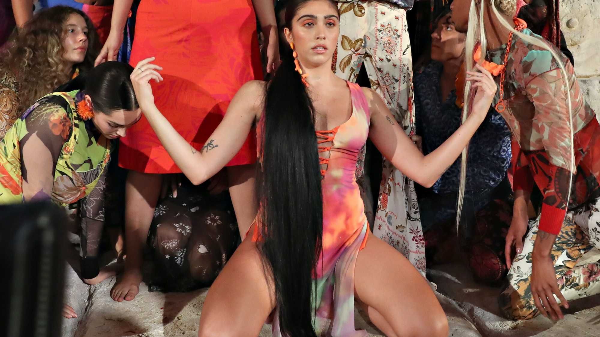 With an ode to the American label’s early 90s campaigns, capturing an element of play and whimsy, Leon dons mix and matched vibrant prints, neon accessories, and a giant floral bra…a possible homage to her mother’s famed cone bra.
