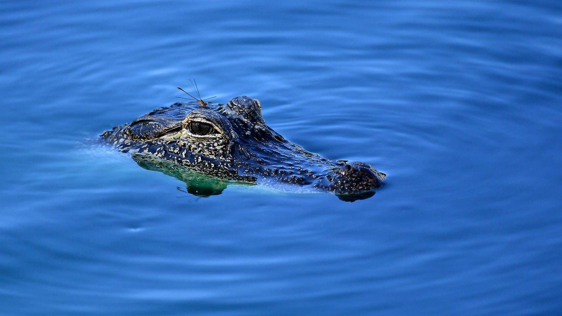 Despite being out of its element, the gator looks calm as it creeps on the lot before sunrise, with a bright Burger King sign glowing in the background.
