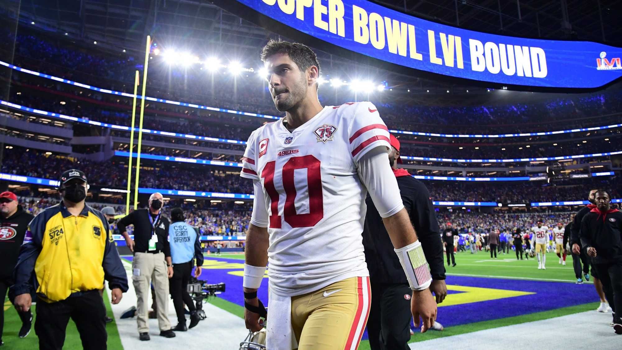 Garoppolo beat Los Angeles twice in the regular season but couldn’t finish the season sweep, completing just 16-of-30 passes (53.3 completion percentage) for 232 yards and a pair of touchdowns in Sunday’s defeat. Down by three late in the fourth quarter, Garoppolo had a chance to be the hero but couldn’t deliver, sealing San Francisco’s fate once and for all with a desperation heave intercepted by Rams linebacker Travis Howard. With third overall pick Trey Lance expected to take over as the starter next season, that may very well have been Garoppolo’s final pass in a 49ers uniform.