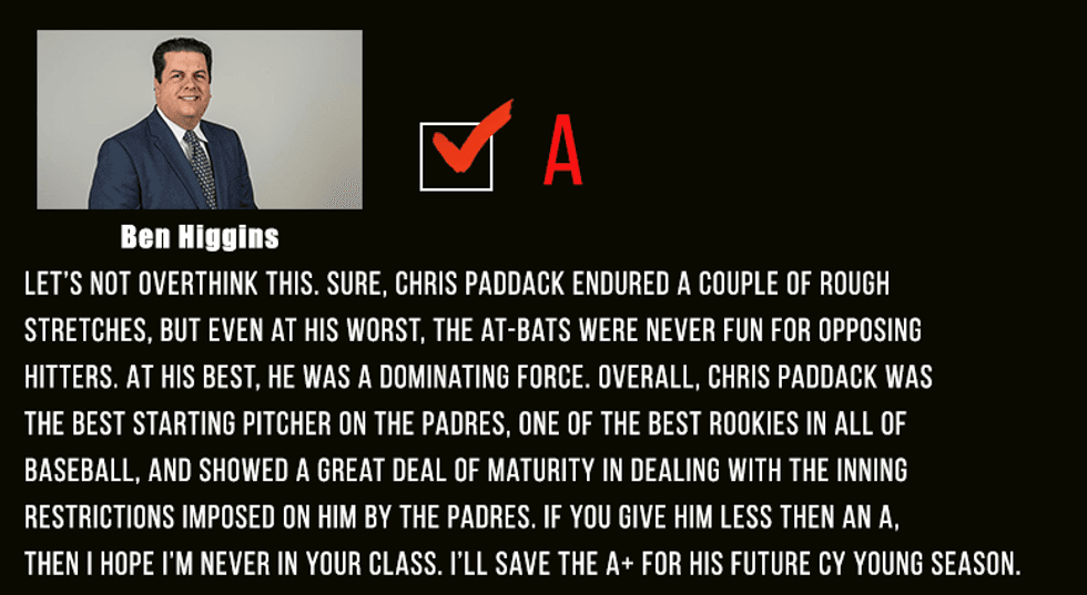 Let's not overthink this. Sure, Chris Paddack endured a couple of rough stretches, but even at his worst, the at-bats were never fun for opposing hitters. At his best, he was a dominating force. Overall, Chris Paddack was the best starting pitcher on the Padres, one of the best rookies in all of baseball, and showed a great deal of maturity in dealing with the inning restrictions imposed on him by the Padres. If you give him less then an A, then I hope I'm never in your class. I'll save the A+ for his future Cy Young season.