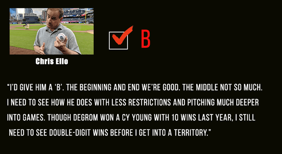 I'd give him a B. The beginning and end we're good. The middle not so much. I need to see how he does with less restrictions and pitching much deeper into games. Though deGrom won a Cy Young with 10 wins last year, I still need to see double-digit wins before I get into A territory.