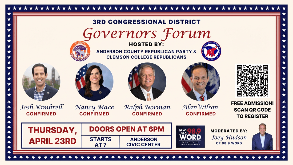 The Anderson County Republican Party and Clemson College Republicans will host the 3rd Congressional District Governors Forum on Thursday, April 23, 2026, at the Anderson Civic Center, 3027 Martin Luther King Blvd., Anderson, SC.