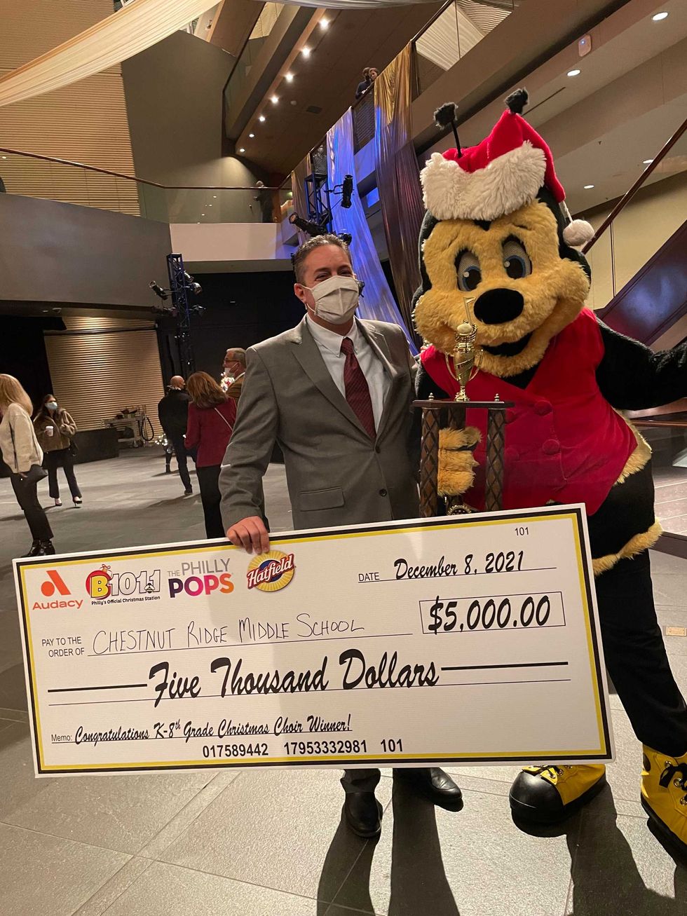 John Masotta, VP of Marketing and Communications for Clemens Food Group, donated $5,000 to Chestnut Ridge Middle School's Music Program on behalf of Hatfield!