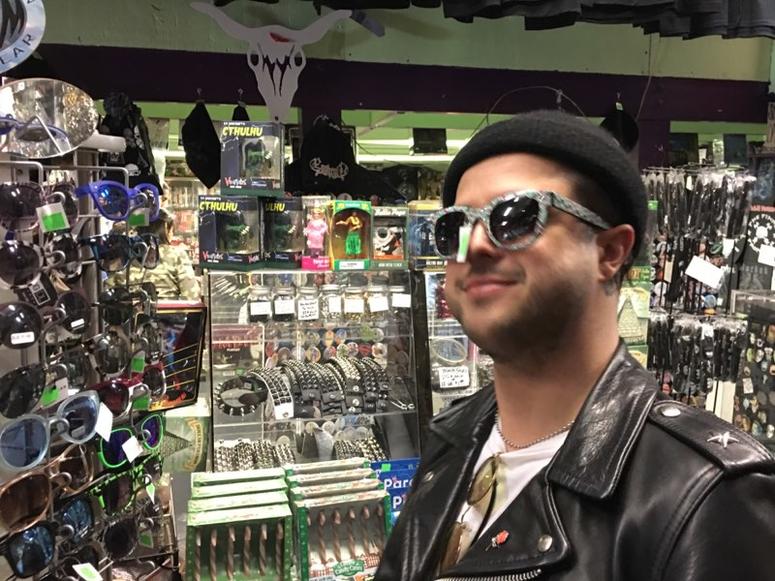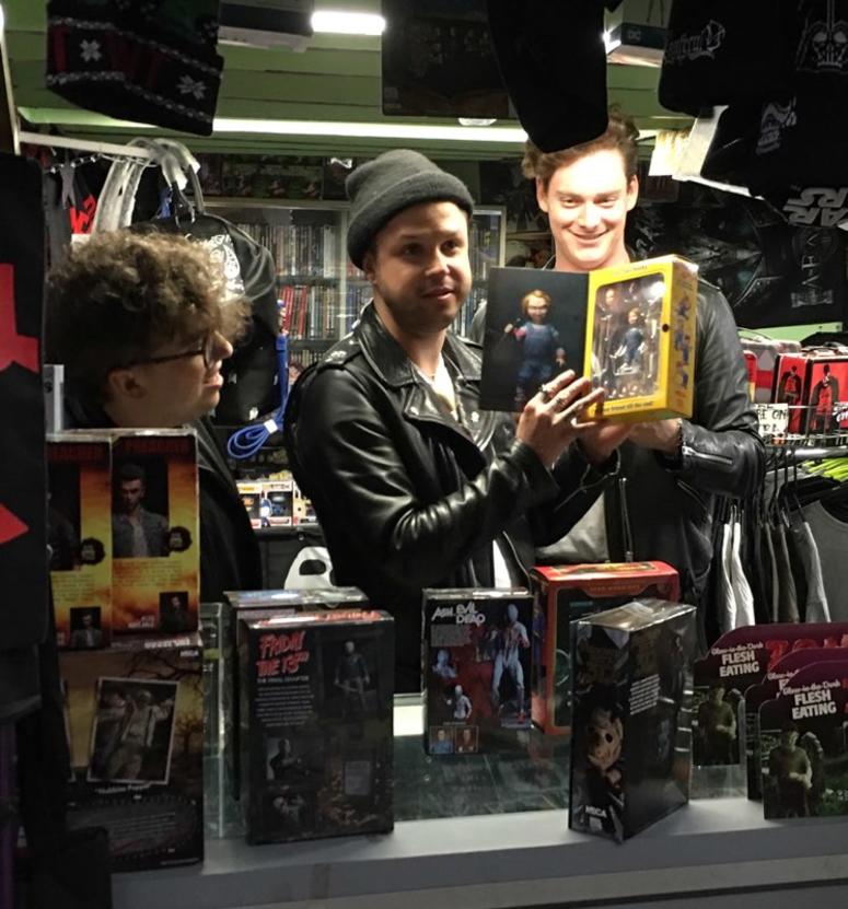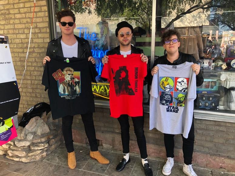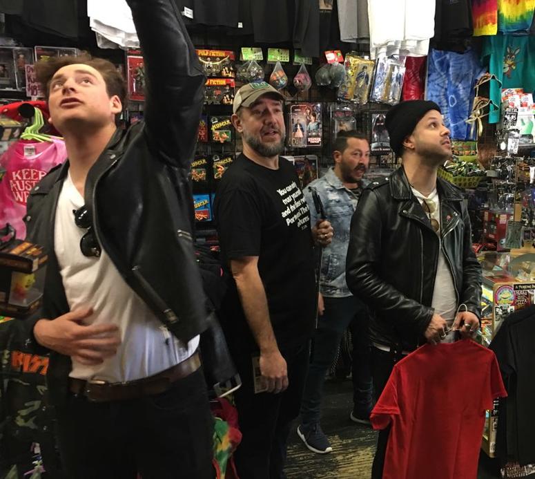 The Los Angeles-based group made up of frontman Mitchey Collins, guitarist Jordan Greenwald, and drummer Sam Price stepped through the door and instantly became the kids in the candy store. Browsing through the Gremlins dolls, sunglasses, and lunchboxes proved a bit overwhelming at first, but then their eyes shifted skyward, and they were sucked in to the shop’s incredible tee shirt collection.
