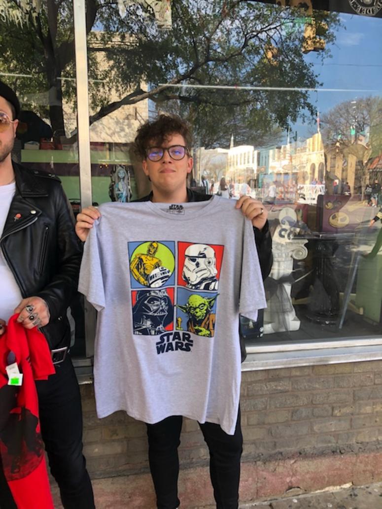 Sam, the self-proclaimed Sci-Fi nerd of the bunch, picked out a vintage ‘70s-looking Star Wars tee. Sam said, “I picked this one out because I love all things Star Wars, and I’m a Star Wars nerd. A great find.”