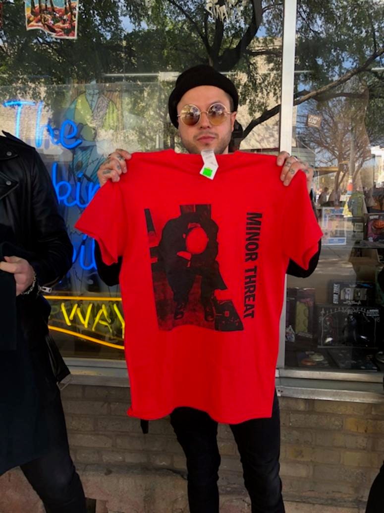 Mitchey decided on a solid Minor Threat tee that “reminded” him “of his youth.” Mitchey added, “I grew up listening to these guys and spent many days at the skate park with Minor Threat in my headphones. This really brings me back.”