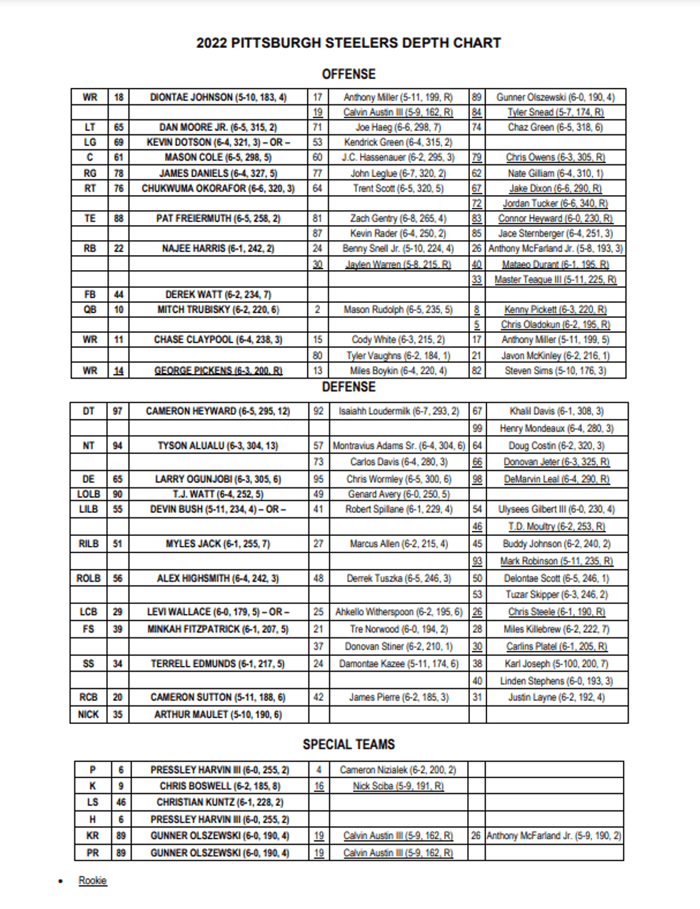 Mitch Trubisky listed as the starter, and he's gotten most of the first-team reps. Mason Rudolph is second, that is also consistent with how it's mostly gone at camp. Pickett is third.