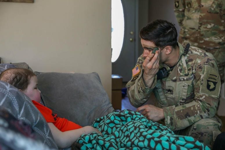 As part of the visit, eight-year-old Braxton received several gifts, including a tutorial on how to apply camouflage paint to his face from Sgt. Julian Sierra, an instructor with the Pre-Ranger Course.