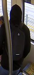 The suspect is described as a Black male, about 25 to 30 years old, 5'5" tall, 180 pounds, with short black hair, a mustache, and a scruffy beard. He was wearing a black hoodie, blue jeans, and was carrying a black or dark grey backpack with a small, white logo on it.