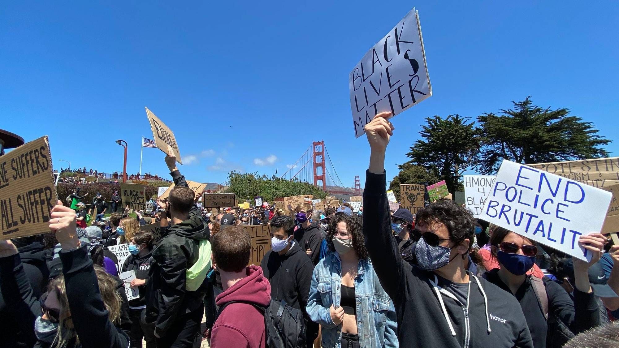 The group originally got out of their vehicles after the tunnel at Treasure Island just before 5 p.m., then moving up the roadway to about halfway over the San Francisco side of the span. Many dispersed after a brief standoff with officers, but their vehicles remain on the bridge.