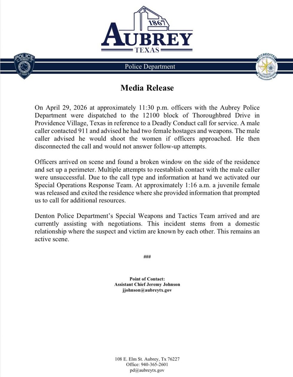 The suspect released one hostage around 1:15am. After speaking with her, police called for the Denton County SWAT team. McKinney tactical teams are also on the scene along with officers from Prosper. Aubrey provides police services to Providence Village.