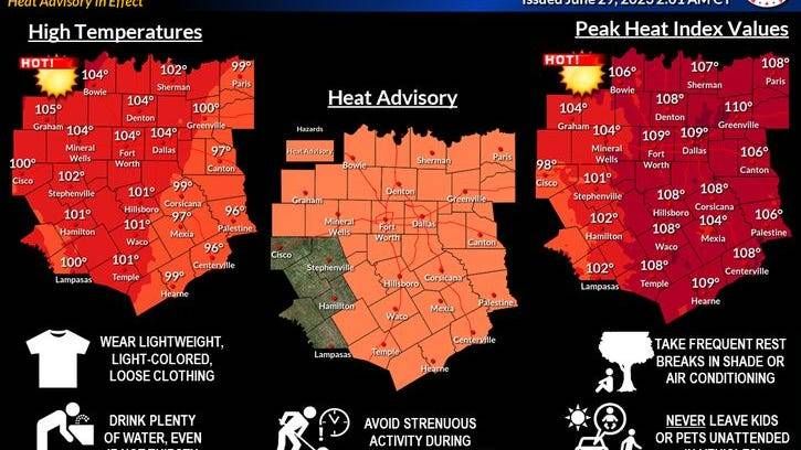 The Dallas-Fort Worth area is under a Heat Advisory through 8 p.m. thursday evening. Today's expected high at DFW Airport is 104 with enough humidity to make the Heat Index 109.