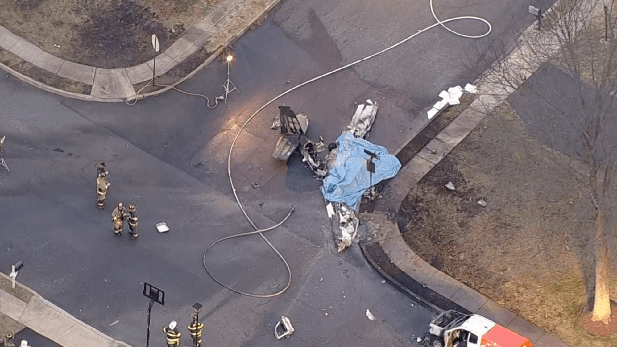 The aircraft went down about 200 feet (60 meters) from the edge of the Pennridge Central Middle School campus. The plane crashed onto a residential street, and "during the impact, a propeller blade separated and landed in a residence," the safety board's report said.