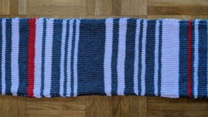 A woman is recording her commuter train delays by knitting them on a scarf