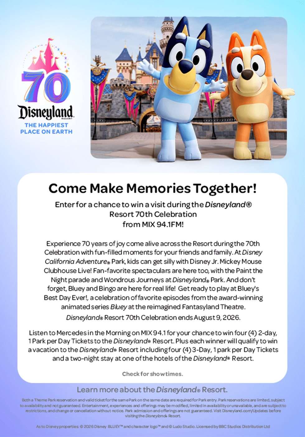 Enter for a chance to win a visit during the Disneyland® Resort 70th Celebration