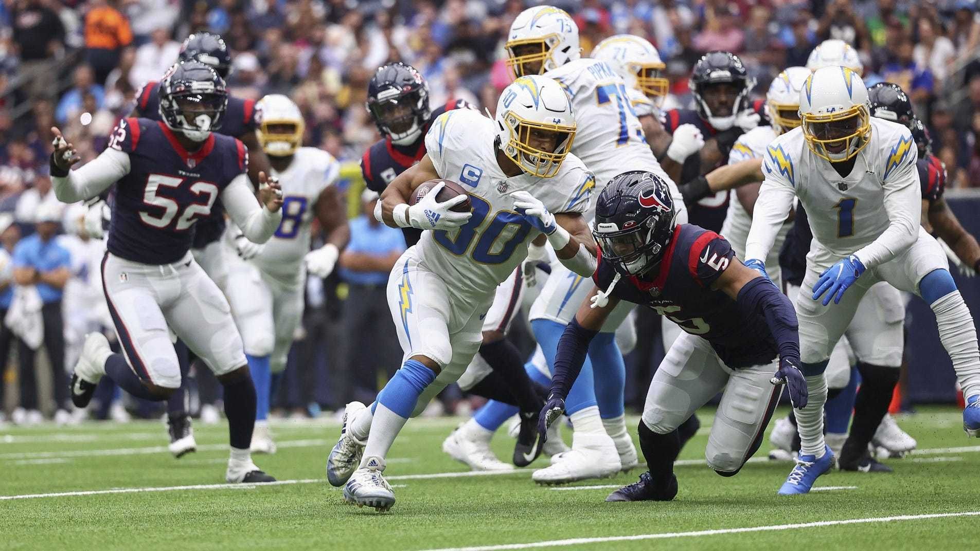 The Texans ran only 13 times, primarily because they fell behind by 20 points in the first half. Dameon Pierce got all the carries, including a 75-yard touchdown run. He took off to the right side, got around the corner and outran the Chargers to the end zone. He finished with 131 yards on 14 carries. Subtract the touchdown and he had 56 yards on 13 carries. He caught six passes for only 8 yards. Rex Burkhead caught five passes for 39 yards and a touchdown, his first since he scored two against the Chargers last season. He also had a 13-yard catch on third down. Rookie fullback Troy Hairston did a terrific job of blocking, including on Pierce's long touchdown run.
