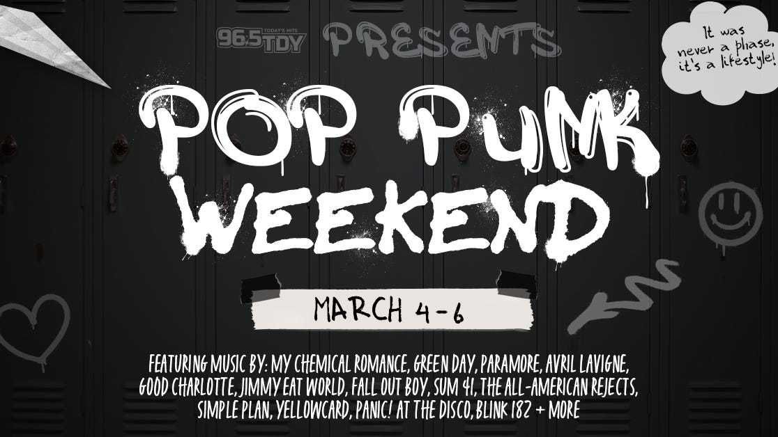 Hear music by My Chemical Romance, Green Day, Paramore, Avril Lavigne, Good Charlotte, Jimmy Eat World, Fall Out Boy, Sum 41, The All-American Rejects, Simple Plan, Yellowcard, Panic! At The Disco, Blink 182, plus MORE during 96.5 TDY's Pop Punk Weekend!