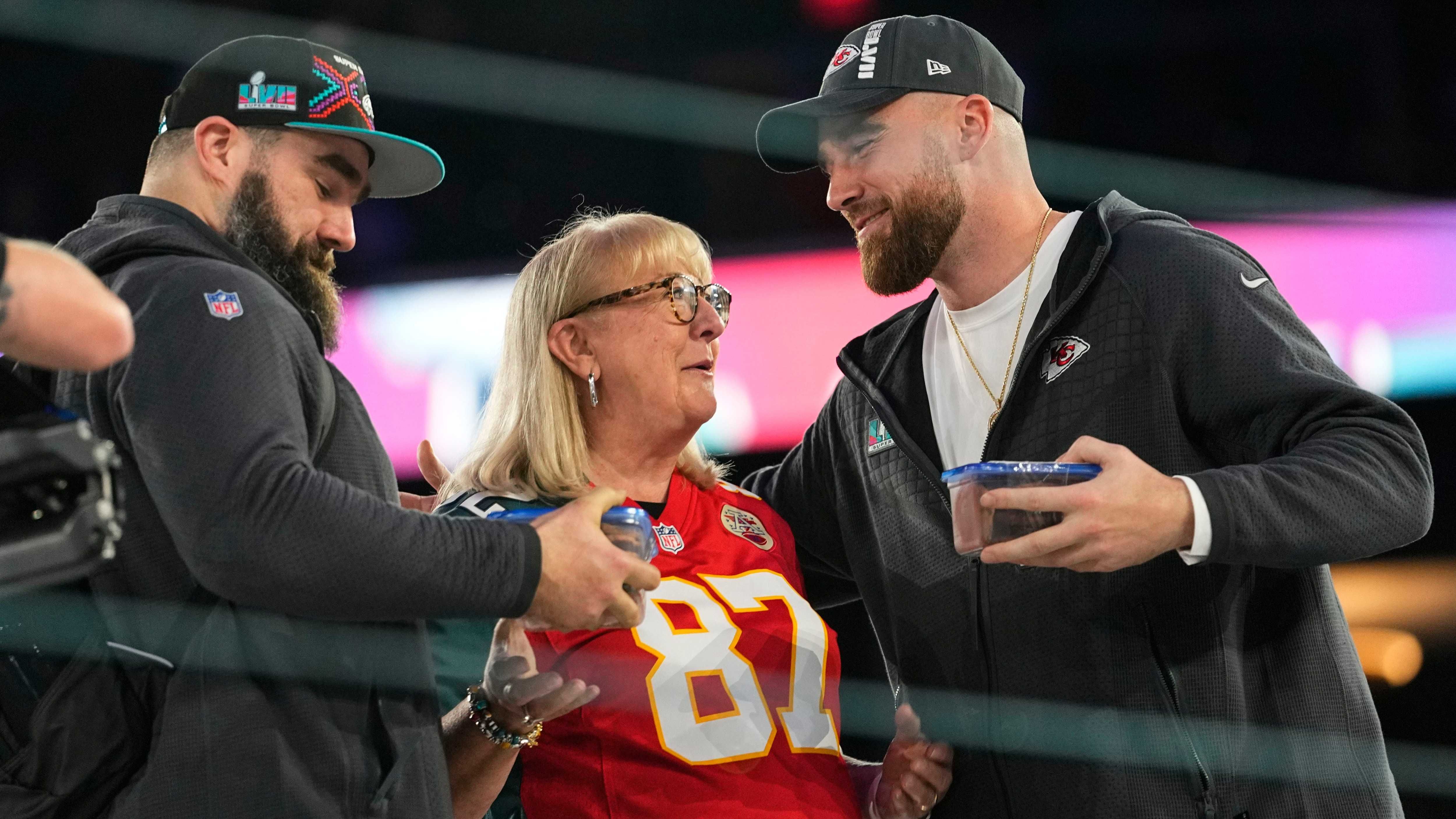 In a promo for the latest episode of Jason and Travis Kelce's weekly New Heights podcast, the brothers get choked up talking about how their mom, Donna, became a superstar during Super Bowl (also known as “Kelce Bowl”) week.