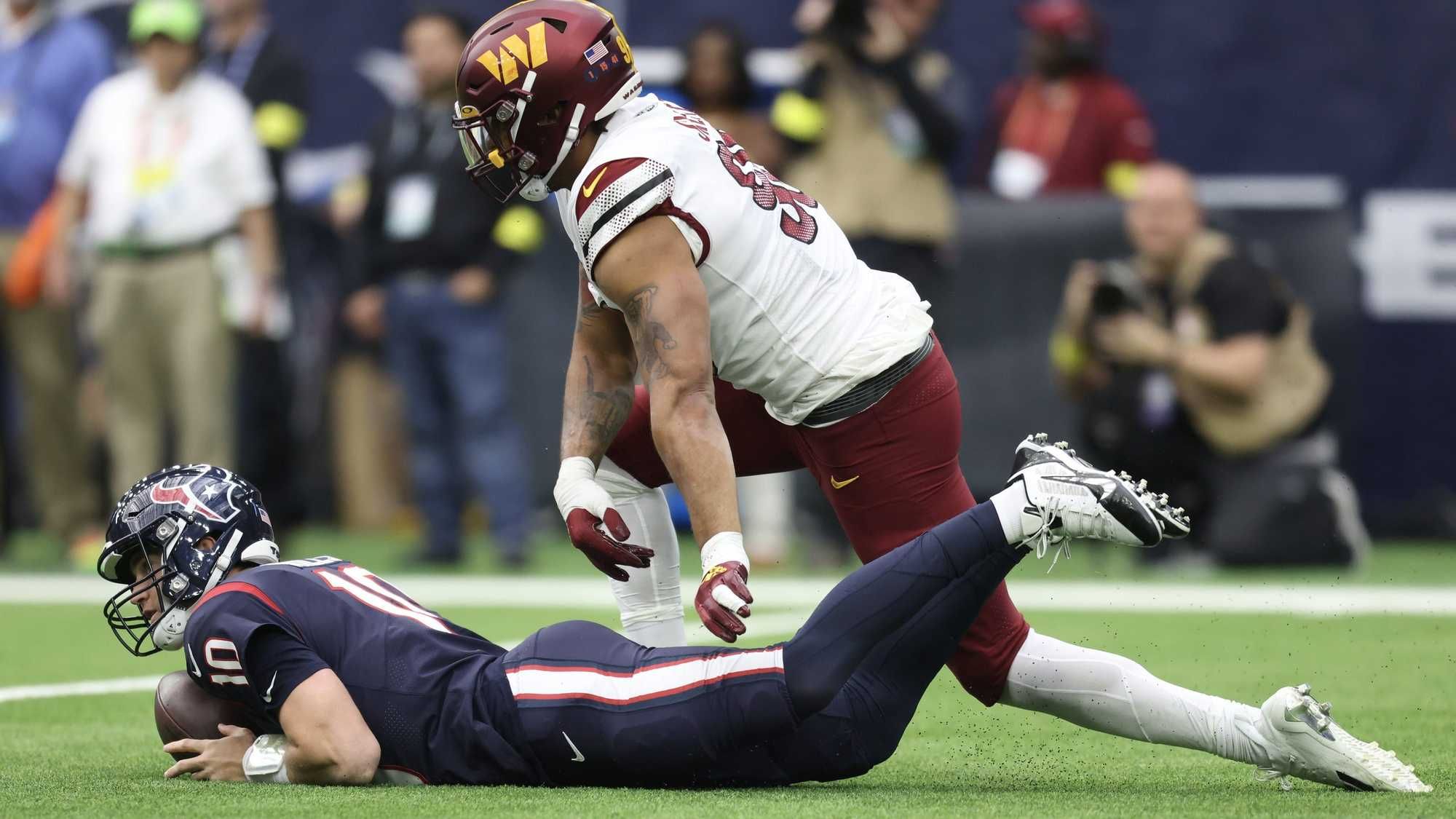 Playing through a shoulder injury for the last month, the No. 15 overall pick had still only allowed two sacks entering Sunday's game against the Commanders.