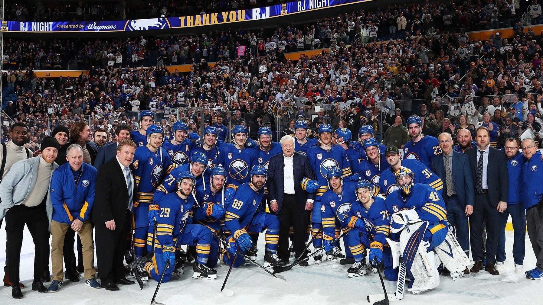 The Sabres honored iconic broadcaster Rick Jeanneret on April 1 by raising a banner to the rafters.