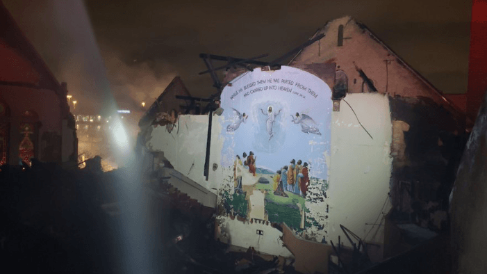 The church caught fire last week, not long after Rev. Gerald Dew presided over a Good Friday service. The fire burned everything except a mural of Jesus ascending to the heavens.