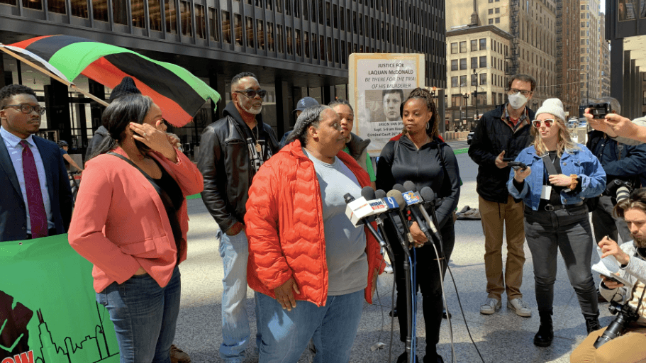 Relatives of Daisy Hayes along with Shannon Bennett, of the Kenwood-Oakland Community Organization, stood outside the criminal courts building, expressing their frustration in the acquittal.