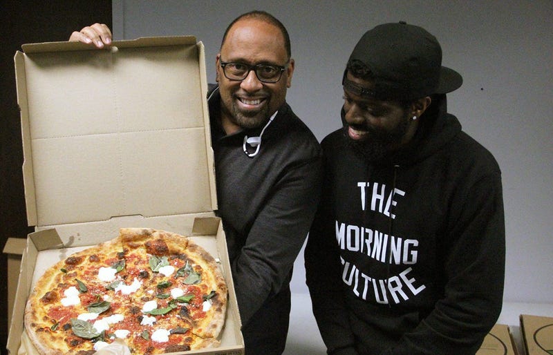 Today Nina & Rafi delivered stacks of their most popular pizzas to V-103, and The Morning Culture with Frank Ski, Jade Novah & JR gave the pies a try. Nina & Rafi is located in Studioplex Alley on the Altanta BeltLine, and is run by cofounders Billy Streck (owner of Cypress Street Pint & Plate, Hampton + Hudson and others), and Anthony Spina, whose O4W Pizza restaurant in Irwin Street Market was famous for its New-Jersey-style, square-shaped "Grandma Pie" before it closed a couple years ago and relocated to Duluth. Now, Spina's pizzas are back inside the perimeter, feeding Beltline visitors once again to rave reviews. But do Nina & Rafi's pies pass The Morning Culture's taste test?
