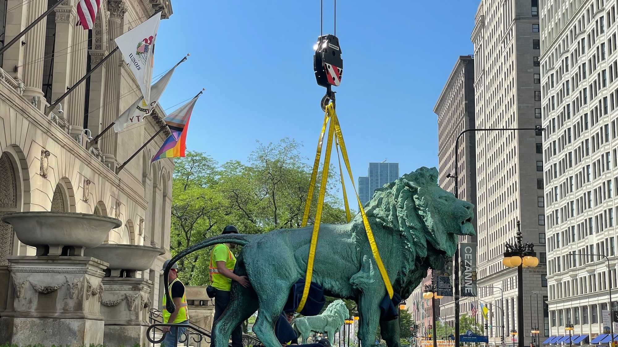 The two famed bronze lions that have guarded the steps of the museum along Michigan Avenue since 1893 were removed last month for much needed cleaning. Tuesday they were reinstalled in their familiar place.