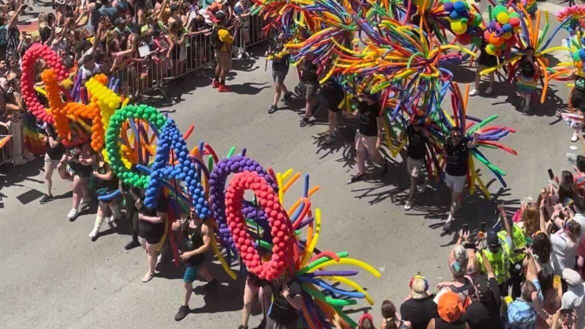 At the parade's launch point, thousands upon thousands were lining the streets, above which rainbow flags and American flags were flying while vendors sold T-shirts, hats, balloons and more to parade attendees.