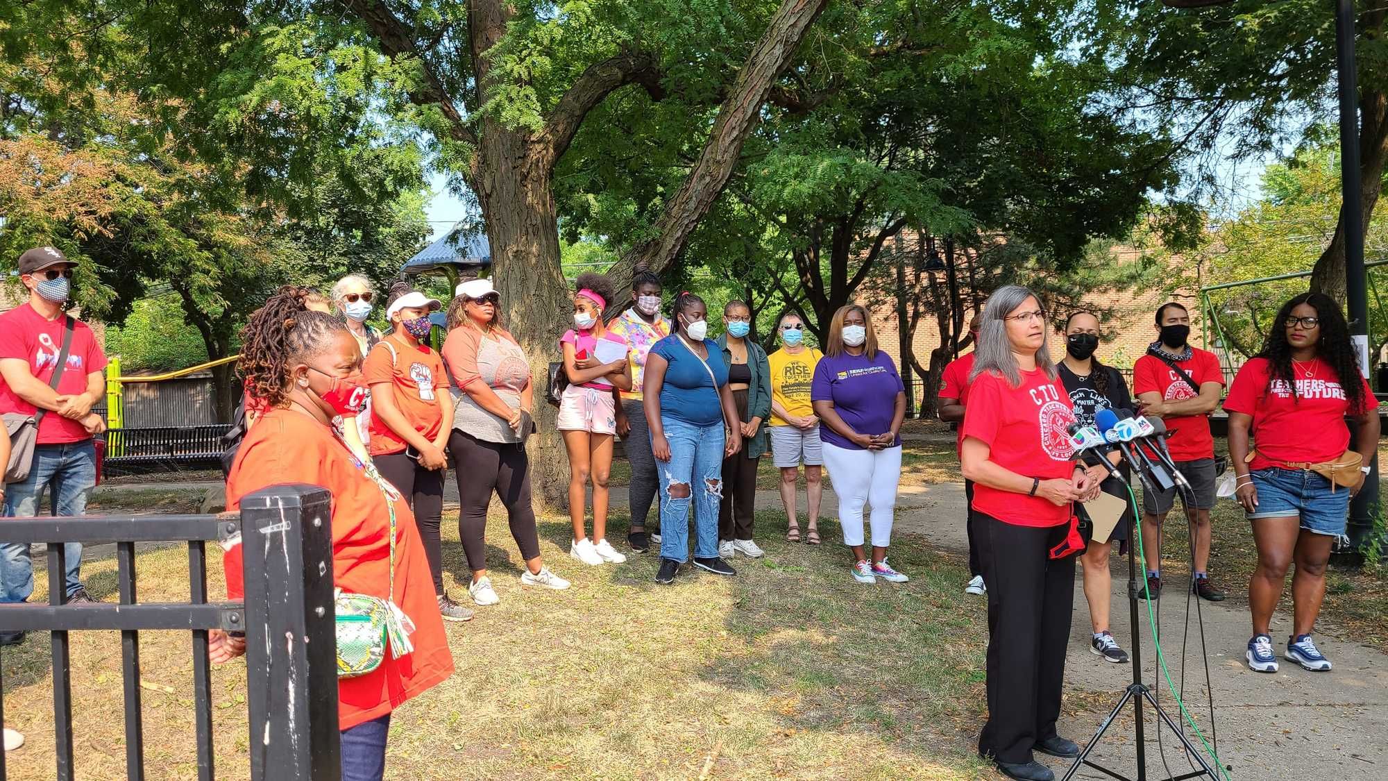 "We are beginning without a comprehensive reopening agreement. This is a real problem. So far the city has not been willing to agree to metrics, which would close schools and keep us safe if this surge continues," Sharkey said at a Wednesday morning rally outside Benito Juarez Community Academy in Pilsen. "They are trying to cut social distancing in half. They are trying to cut a number of other provisions, which we've had in place since last spring; and they are not willing to make those commitments. And we are not willing to sign an agreement without those commitments, so we are at an impasse."