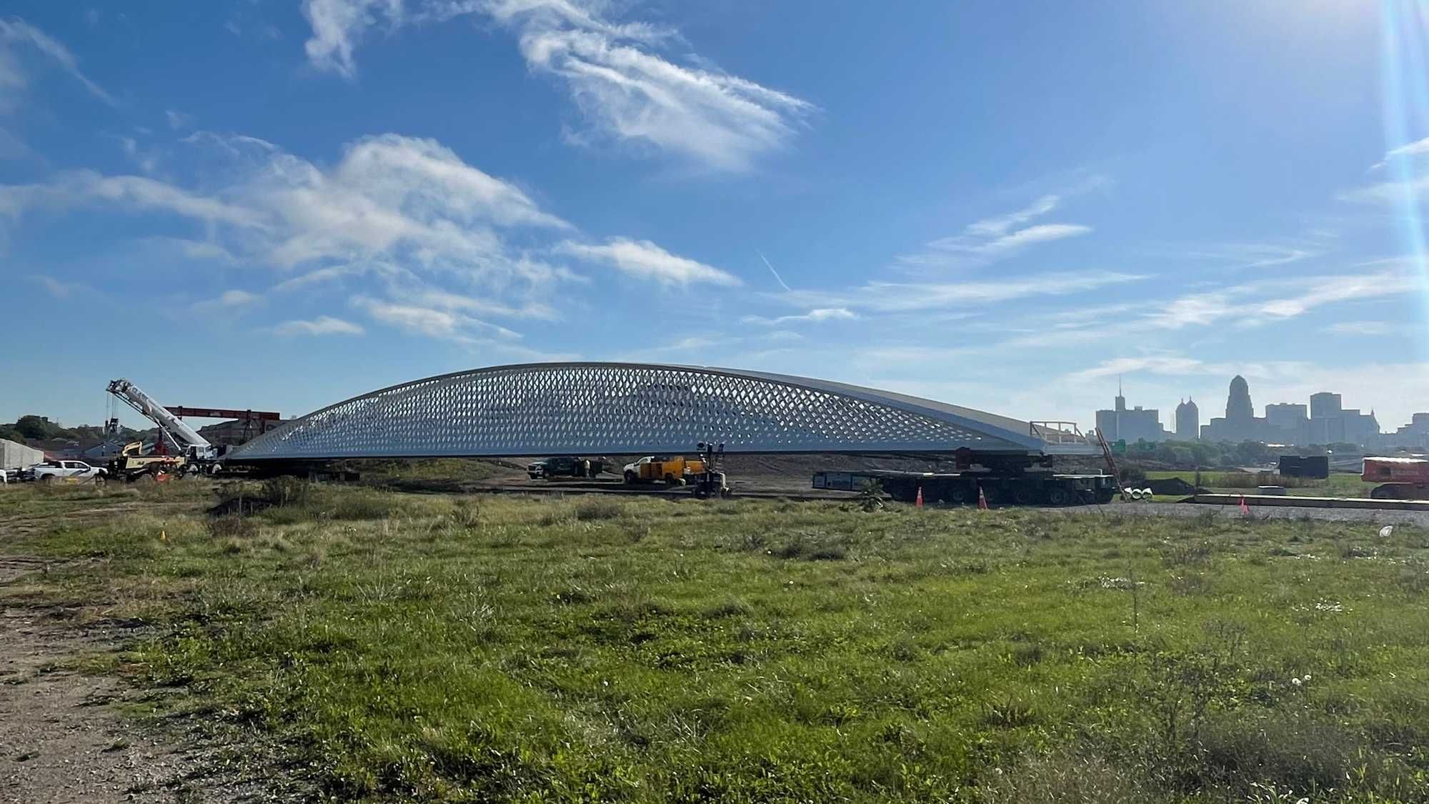 The pedestrian bridge is not expected to open to pedestrian traffic for several months after it is fully put in place and secured. The new Ralph Wilson Park is expected to be opened sometime in early 2026.