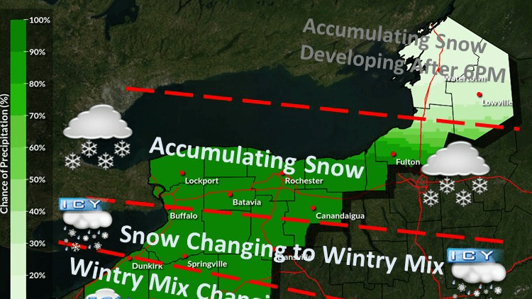 "It's actually going to be a line that progresses up," Parker said. "If you're in West Seneca and you're starting to hear those pings, folks in the Northtowns might still say, 'Well I still see snow here.' It's literally going to change on a mile-by-mile basis. Eventually deeper into the evening, we're going to see some freezing rain, and it should swallow up all of Niagara County, Orleans, Northern Erie, Genesee, and a chunk of Central Erie County within that swath."