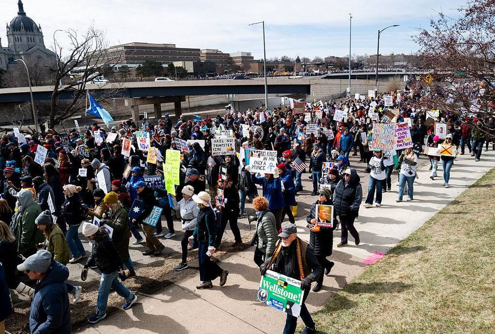 Demonstrators march to a "No Kings" protest outside the State Capitol building on March 28, 2026 in St Paul, Minnesota. This is the third nationwide "No Kings" protest held against the Trump administration.
