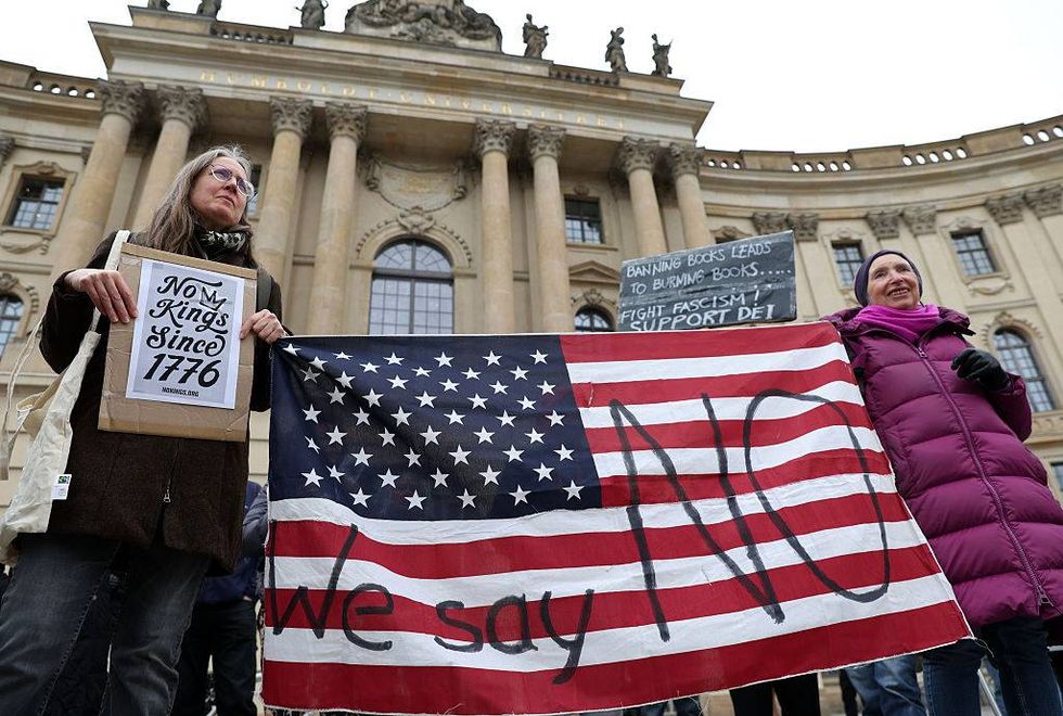 Activists attend a "No Kings" protest against the current U.S. federal government on March 28, 2026 in Berlin, Germany. Millions worldwide, including in all 50 U.S. states, are expected to participate in over 3,000 such protests against the Trump administration's actions and policies and in support of topics ranging from abortion access and gun control to immigration and voting rights, in the third instance of the demonstration organized by labor unions and other grassroots organizations.