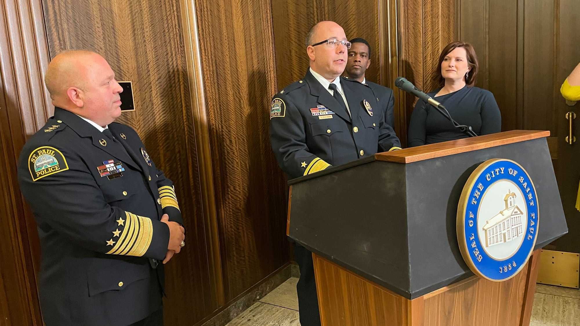 Chief Todd Axtell: Well, Jeremy is really the perfect pick at the perfect time for our city. He just brings such a calm and competent nature to the position. We really need that steady leadership going through into the busy summer months. I couldn't be more happy with the pick from Mayor Carter and Jeremy will do an incredible job and continue to do what we all do. All chiefs who have served in the St. Paul Police Department continue to build on the legacy of the giants that we have followed. The chiefs that I have served in the past, um, starting with Bill McCutchen, Chief Finney, John Harrington and Tom Smith. And so Jeremy will continue to do everything we have done in the past, just to try to make the department better when you leave the position. And I know that Jeremy will do that, he'll make it better than he found it.