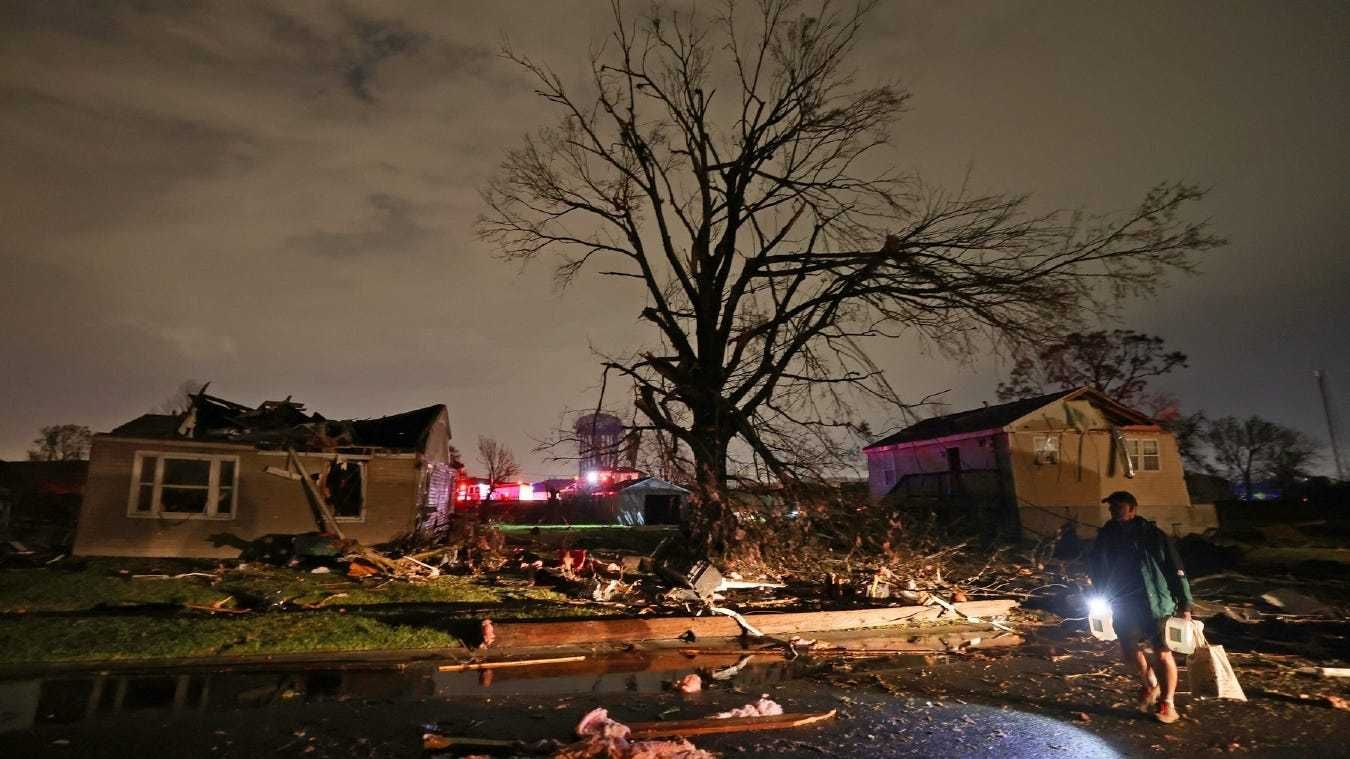 Richie Majors and his daughter Lilly walk through their tornado-damaged neighborhood on March 23, 2022.