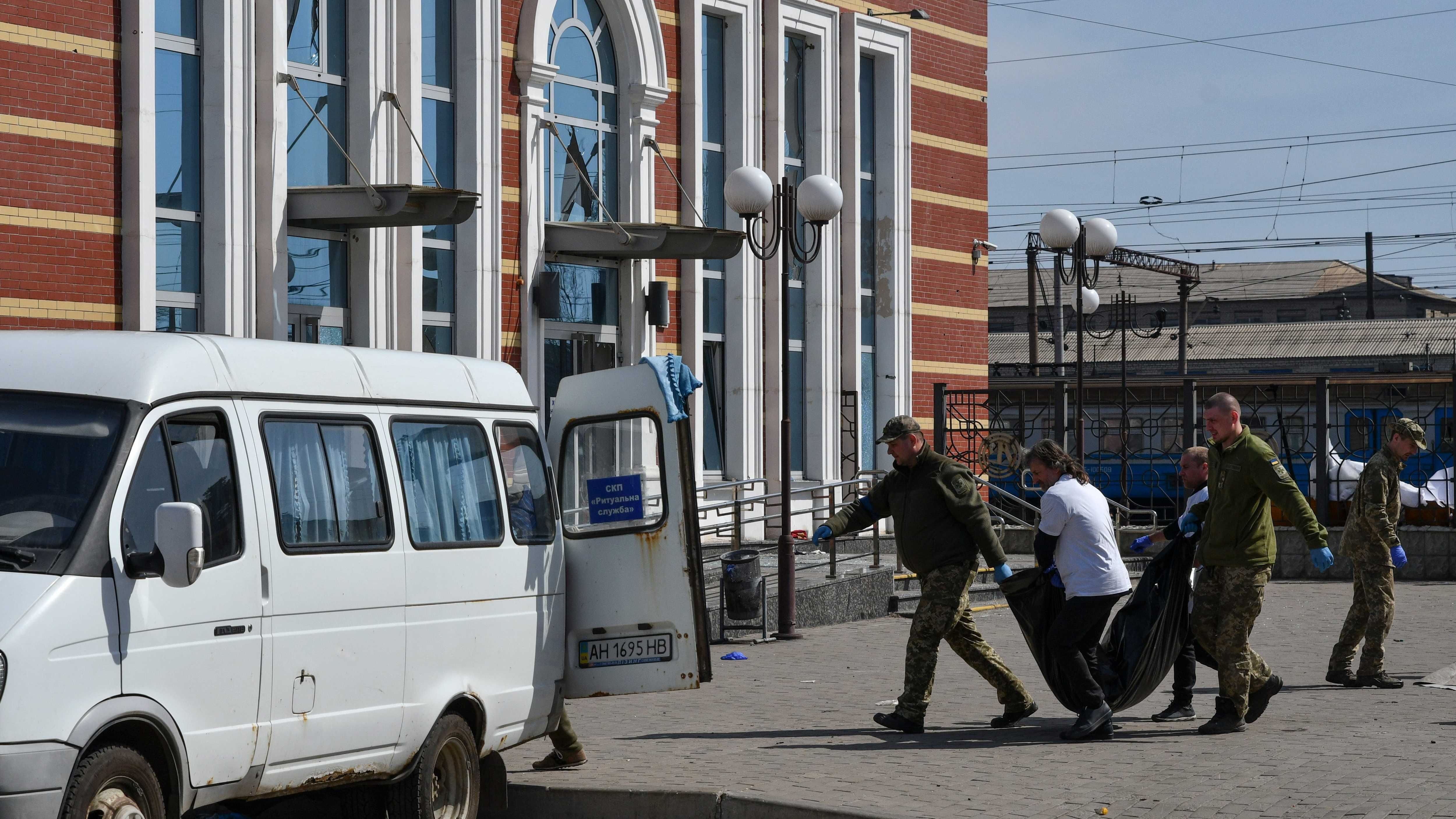 The Russian Defense Ministry denied targeting the station in Kramatorsk, a city in the eastern Donetsk region, but Zelenskyy blamed Russia for the bodies lying in what looked like an outdoor waiting area.
