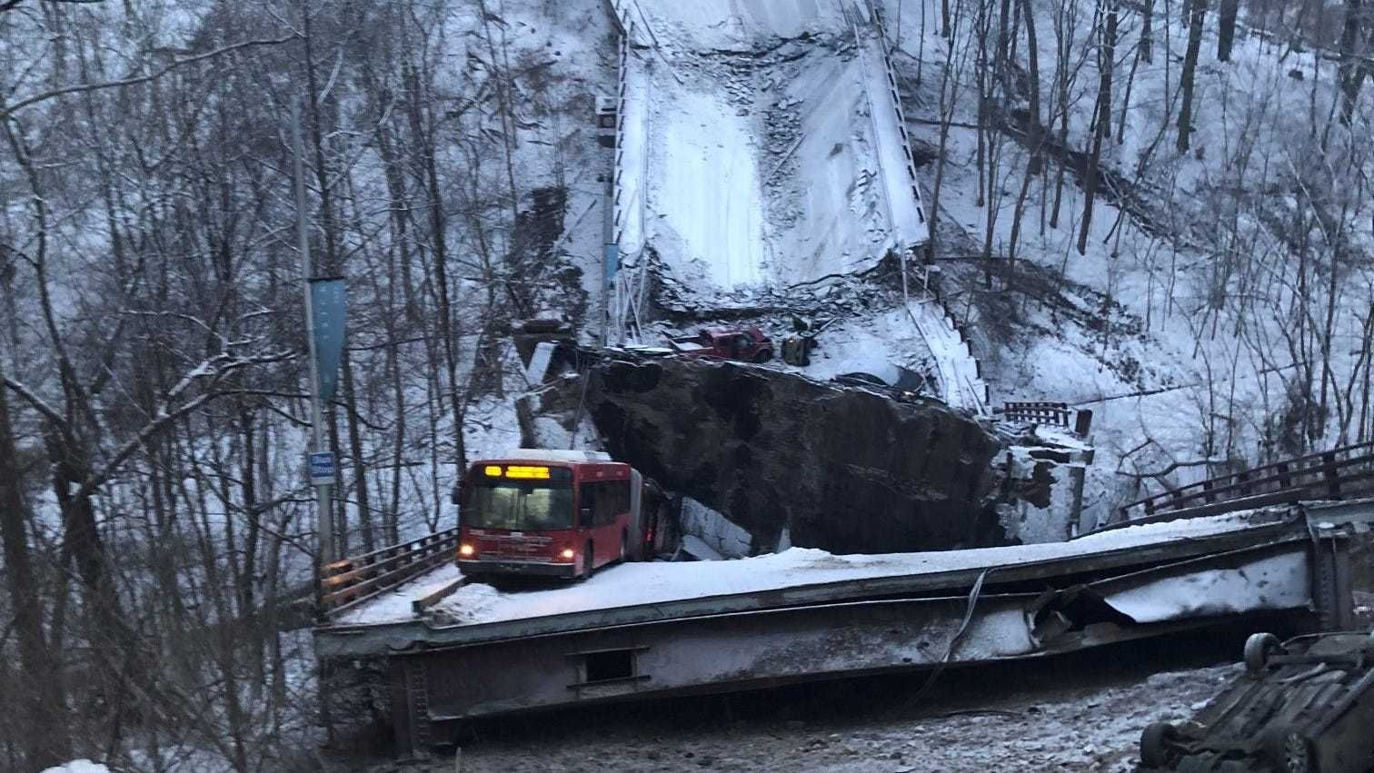 Several cars and a city bus were crossing the Forbes Avenue bridge in Frick Park when it collapsed just after 6 a.m. Ten people were taken to the hospital for treatment, but none of the injuries are considered life-threatening.