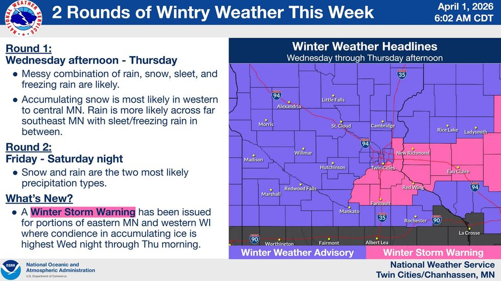 It's no joke on this April fool's day. The National Weather Service has issued a Winter Weather Advisory for a large swath of Minnesota and Western Wisconsin, with a Winter Storm Warning from the southeast metro and areas further to the east.