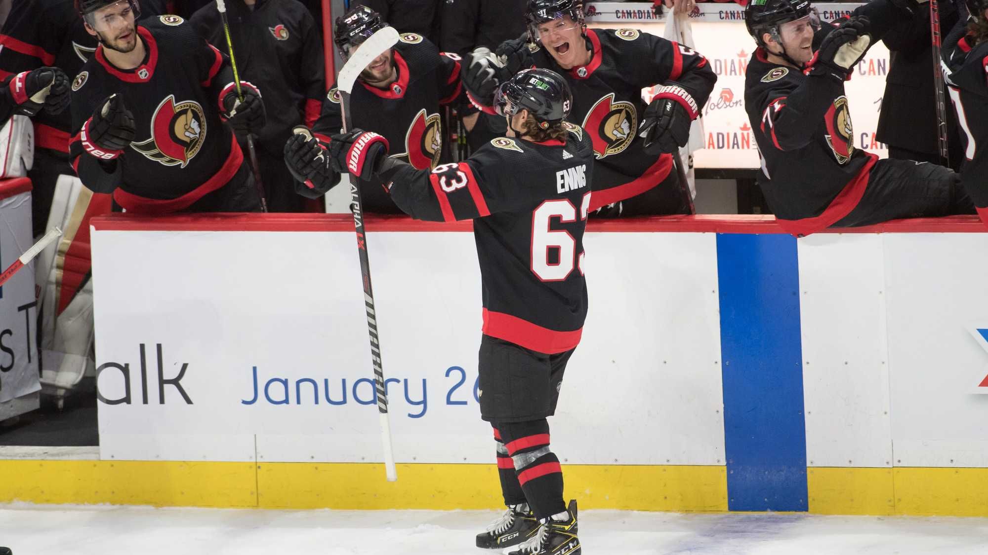 It’s customary for fans to celebrate such an occasion by hurling hats onto the ice, but with the 19,000-seat capacity Canadian Tire Centre all but empty, only one hat was thrown. It belonged to Ennis’ teammate, goaltender Anton Forsberg, who got a breather on Tuesday with Matt Murray in net.