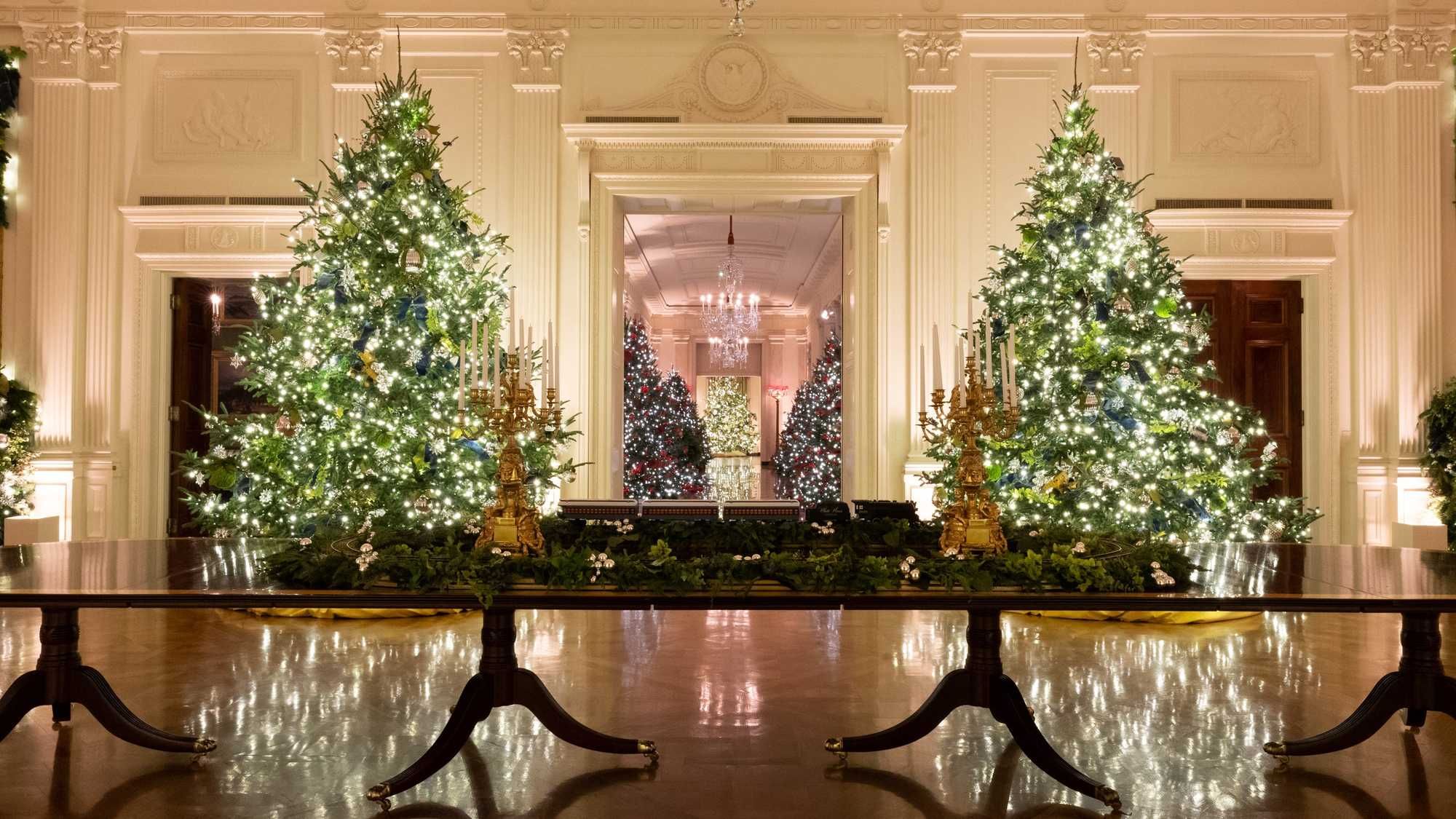 President Trump and first lady Melania Trump are stylistically in-sync for this year's official Christmas portrait, with the pair wearing matching tuxes.