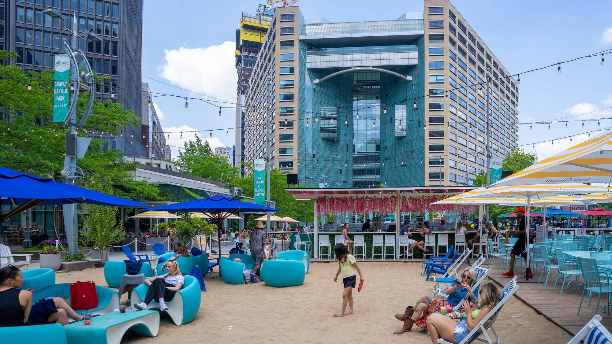 In the summer months, the Beach at Campus Martius — which initially came to fruition following a collaborative effort between the Project for Public Spaces and the Downtown Detroit Partnership — acts as a counterpart to the winter activities, drawing in thousands of people of all ages to enjoy a taste of Northern Michigan in the city.
