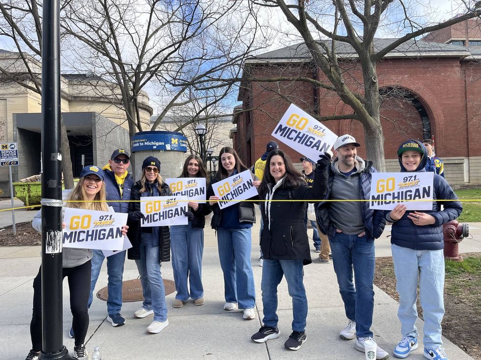 UM fans with Go Michigan and 97.1 The Ticket signs along the parade route