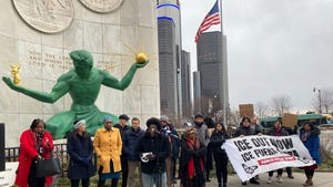 Anti-ICE protesters gather at the Spirit of Detroit, urge local leaders to limit immigration enforcement in the cityJanuary 13, 2026 -