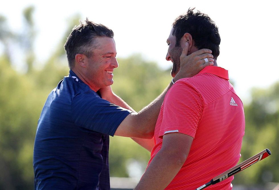 Jon Rahm of Spain and Ryan Palmer of the United States pose with the trophy after winning during the final round of the Zurich Classic at TPC Louisiana on April 28, 2019 in Avondale, Louisiana.